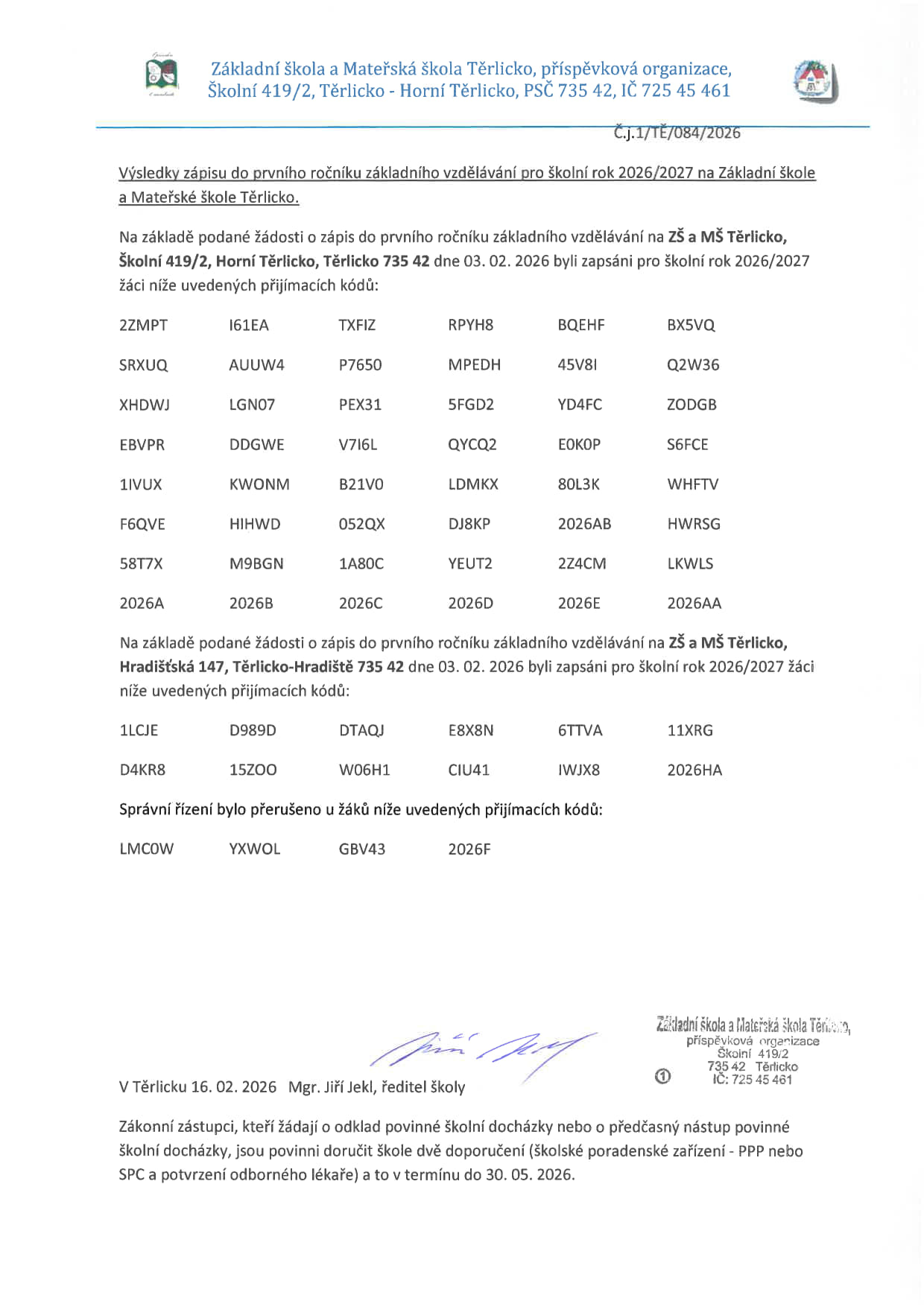 Výsledky zápisu do prvního ročníku základního vzdělávání pro školní rok 2026/2027